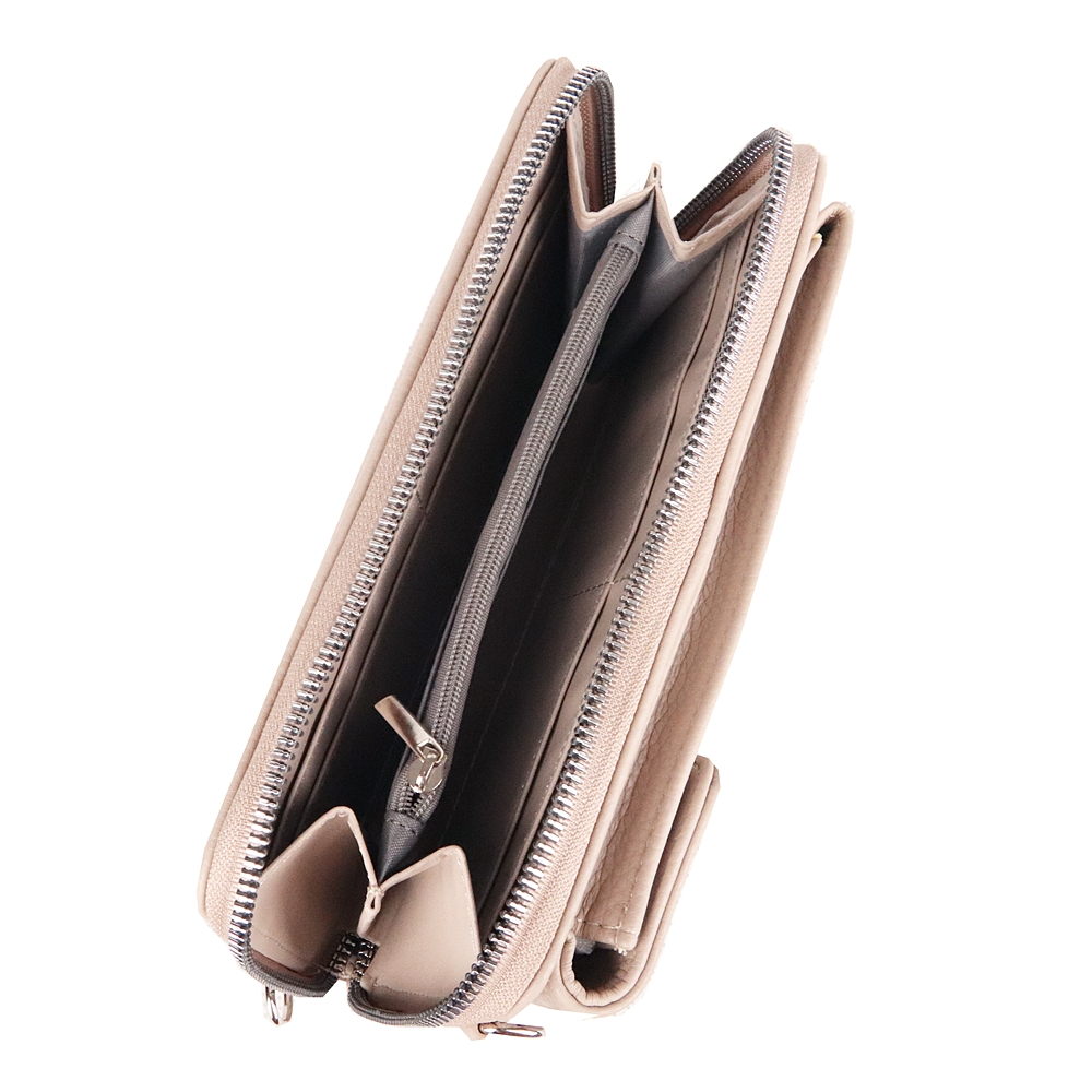 Zadní část, která se uzavírá na zip ze tří stran, pro změnu tvoří podélná peněženka, ve které je 8 slotů na platební karty či doklady, 2 podélné zastrkávací přihrádky, 2 otevřené přihrádky na bankovky a zipová kapsička na mince.