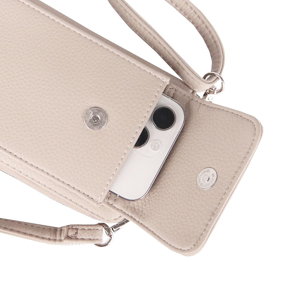 Přední část, která se uzavírá na magnetický druk, je tvořena volným prostorem na uložení mobilu (do velikosti 16,5 x 7,5 cm).