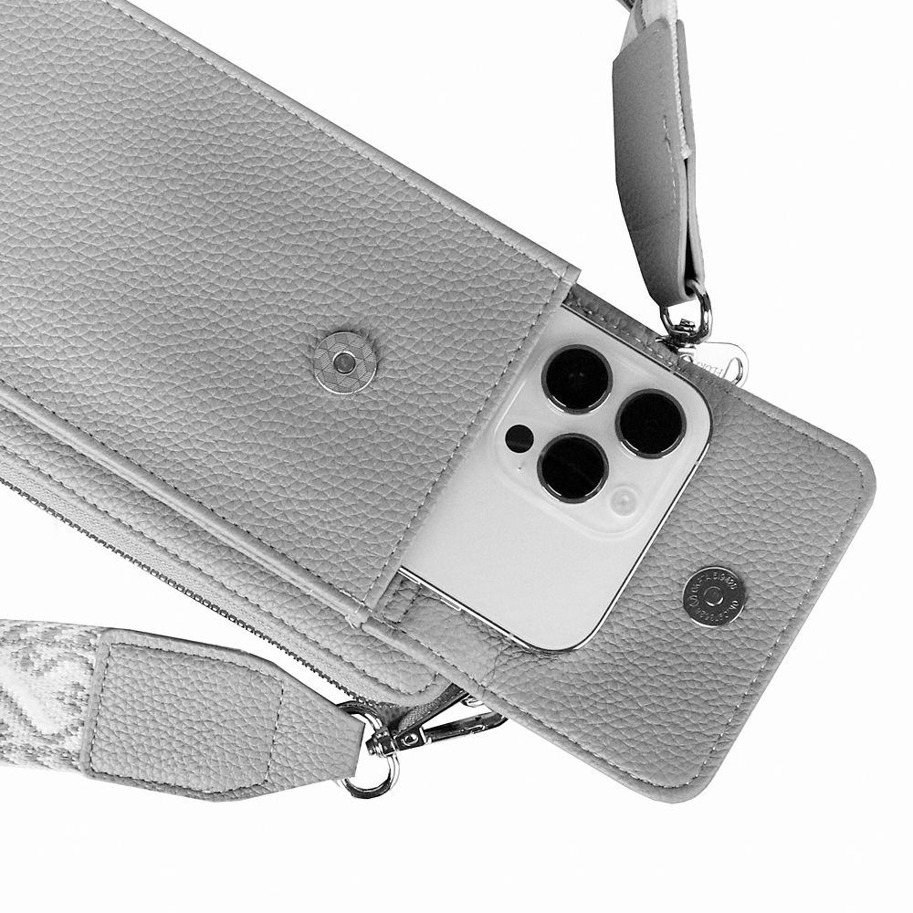 Přední část, která se uzavírá na magnetický druk, je tvořena volným prostorem na uložení mobilu (do velikosti 16,5 x 7,5 cm).