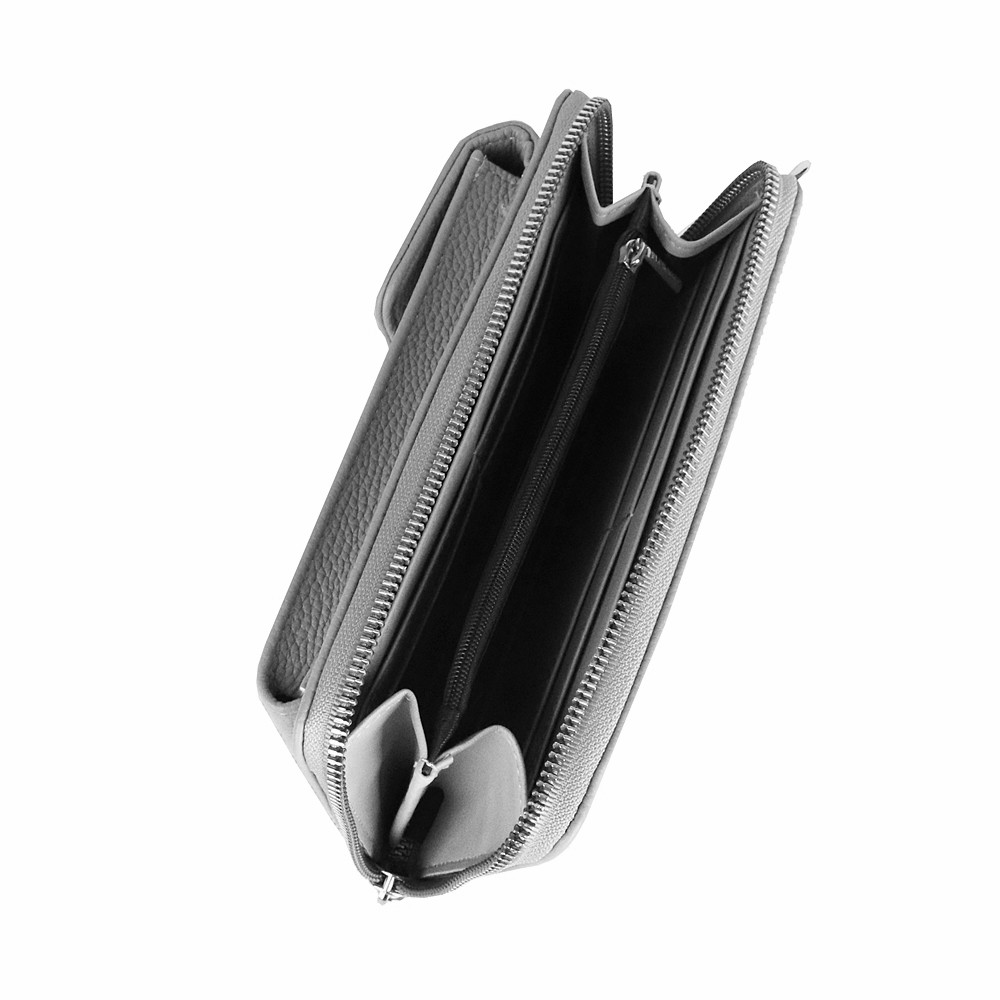 Zadní část, která se uzavírá na zip ze tří stran, pro změnu tvoří podélná peněženka, ve které je 8 slotů na platební karty či doklady, 2 podélné zastrkávací přihrádky, 2 otevřené přihrádky na bankovky a zipová kapsička na mince.