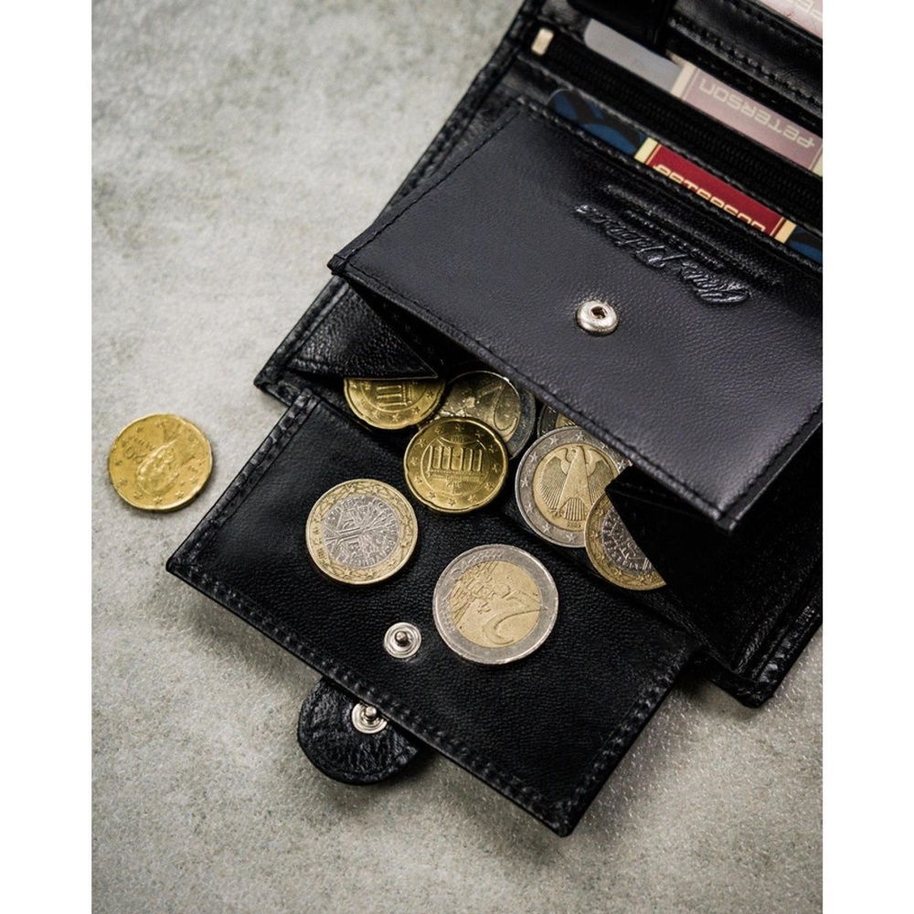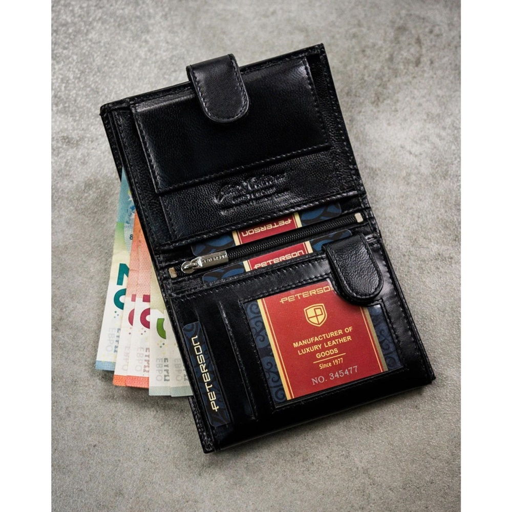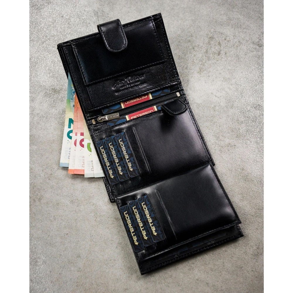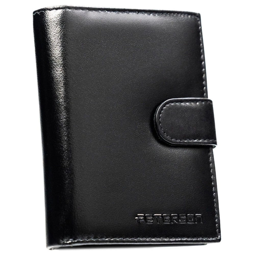 Kožená pevná pánská černá peněženka značky Peterson s vyraženým logem značky na přední straně. Peněženka je orientována na výšku a je uzavírána na upínku.