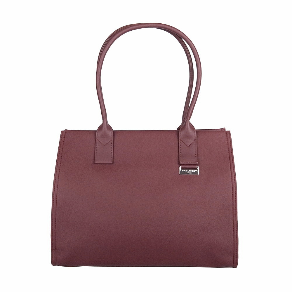 Velká tmavěvínová kabelka na rameno David Jones z pevnější syntetické kůže. Na přední straně (pod uchem) je stříbrné logo David Jones.