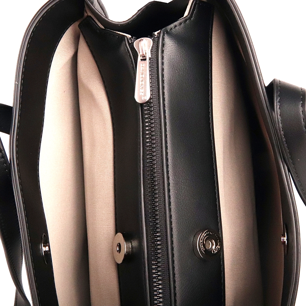 Kabelka je rozdělena na tři samostatné oddíly, oba krajní jsou uzavřeny na druk, prostřední část se uzavírá na zip, pod kterým ve vnitřní části je navíc v podšívce jedna zipová kapsa a jedna otevřená kapsička.
